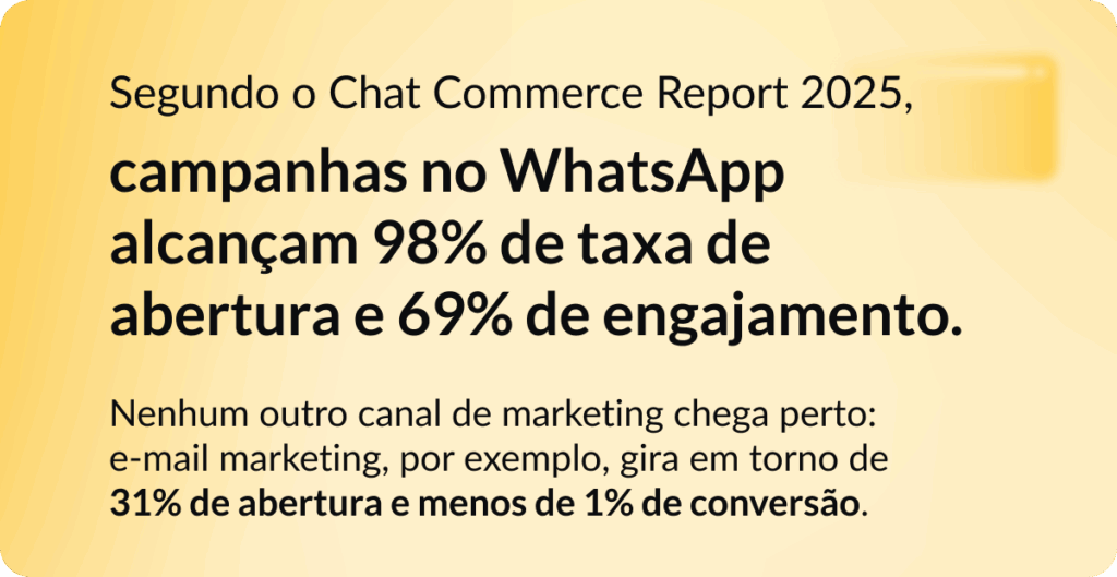 Segundo o Chat Commerce Report 2025, campanhas no WhatsApp alcançam 98% de taxa de abertura e 69% de engajamento. Nenhum outro canal de marketing chega perto: e-mail marketing, por exemplo, gira em torno de 31% de abertura e menos de 1% de conversão.